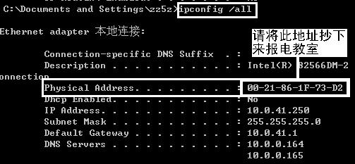 请将“本地连接”下 physical address 项后的一串地址抄下来上报电教室。