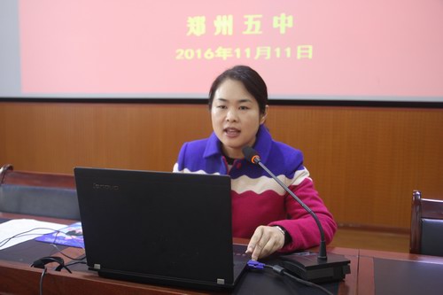 上午,在郑州五中学术报告厅,考察团成员听取了郑州五中课程教学处副主任李靖题为《基于现场 研究提升——以郑州五中为例推动学校发展的力量研究》的专题报告,介绍了郑州五中如何在校长张天佑带领下,依托教师、课程、生态三大支柱和学风、教风、校风三大作风,以为了师生的幸福成长为目标,进而将学校办成一所幸福的平民学校的典型做法。