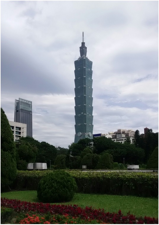 7.3 终于可以看到台北101大厦的全貌。 这是一座现代化的玻璃大厦,耗资580亿新台币建造而成。这次我们登上了89楼的全景观景台,俯瞰了台北市的全貌,并目睹了夕阳和晚霞 。走到89层,我们看到了大厦在多次台风中屹立不倒的决定性部件,一个重达5吨的圆形液压球。它通过自身的液压调整抵消大楼顶部晃动所产生的能量,保证了大楼的稳固。
