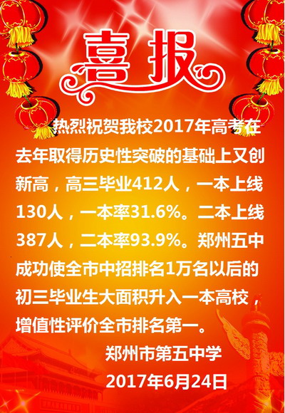 喜讯:热烈祝贺我校2017年高考在去年取得历史性突破的基础上又创新高,高三毕业412人,一本上线130人。二本上线387人。郑州五中成功使全市中招排名1万名以后的初三毕业生大面积升入一本高校,增值性评价全市排名第一。